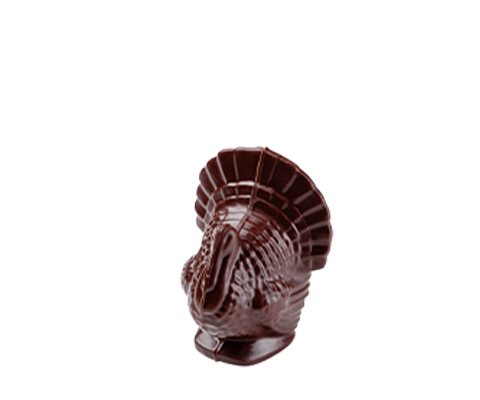 Add a delicious touch to fall festivities with a set of 8 personal-sized hollow Turkeys, made with our Organic and Fairtrade 65% Fran’s Blend Peruvian & Dominican dark chocolate and hand-polished to a brilliant shine.